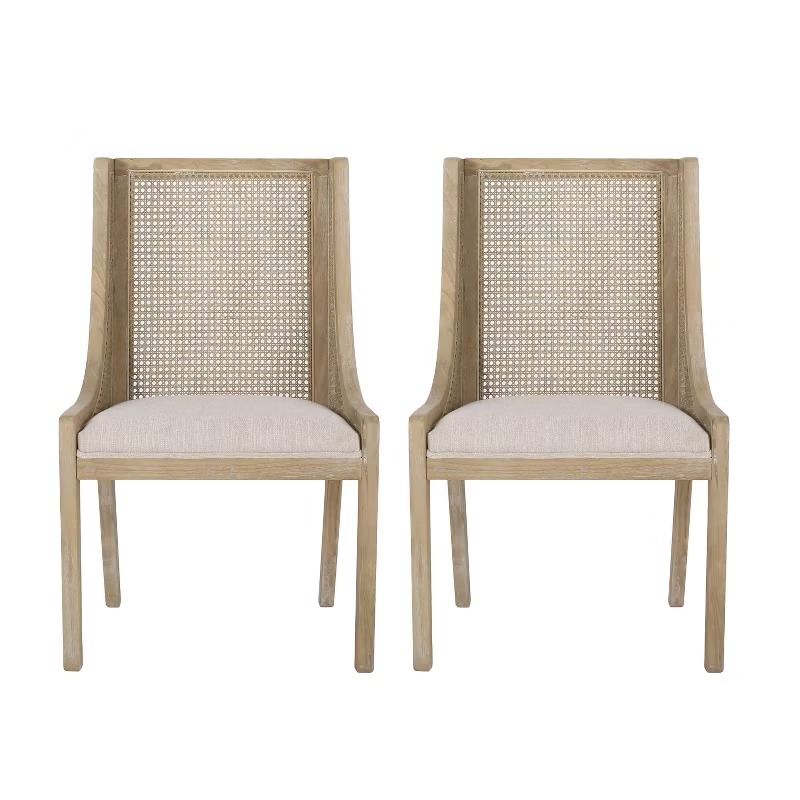 Set of 2 dining chairs with rubberwood frame, fabric seat, and cane (rattan-style) backrest. Suitable for dining rooms and kitchen seating areas.