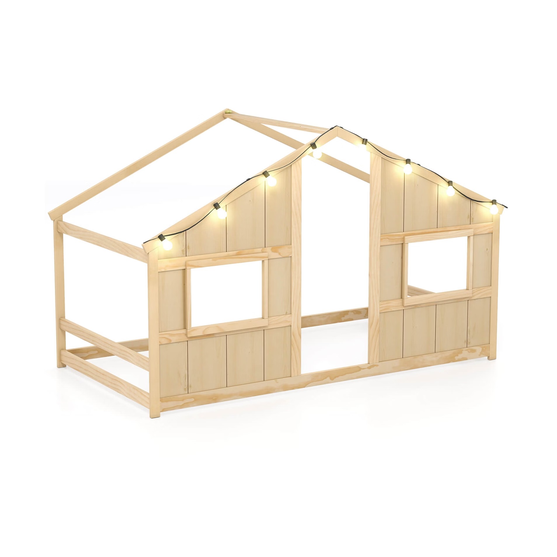 Twin Hausbett aus Holz mit LED Beleuchtung und Hausrahmen Design, bodennahes Kinderbett ohne Lattenrost für Schlaf- und Spielbereich.