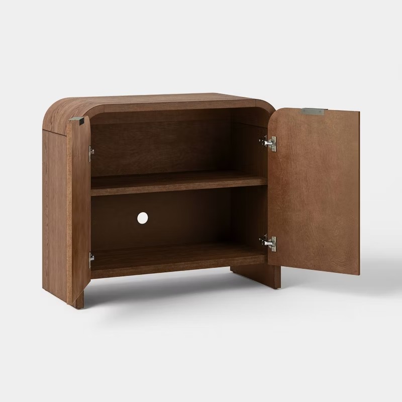 Zweitüriger Aufbewahrungsschrank aus Holzwerkstoff mit verstellbarem Innenfach und Kabelführung, geeignet für geordnete Aufbewahrung und verschiedene Wohnbereiche.